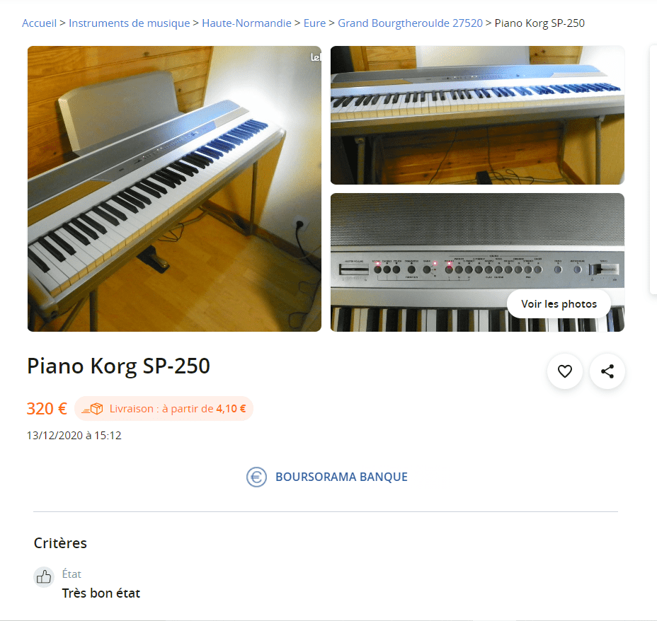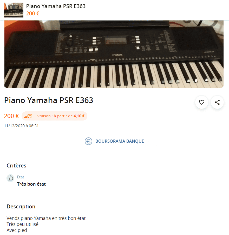 Voici un exemple d'instrument qu'il ne faut pas acheter. Parfois certains vendeurs se sentent pousser des ailes et tentent de vendre à bon prix des instruments qui ont plus de 10 ans ou alors même de vendre leur instrument d'occasion au prix du neuf comme sur cet exemple :